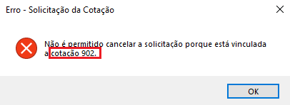 Não é permitido cancelar a solicitação porque está vinculada à cotação.