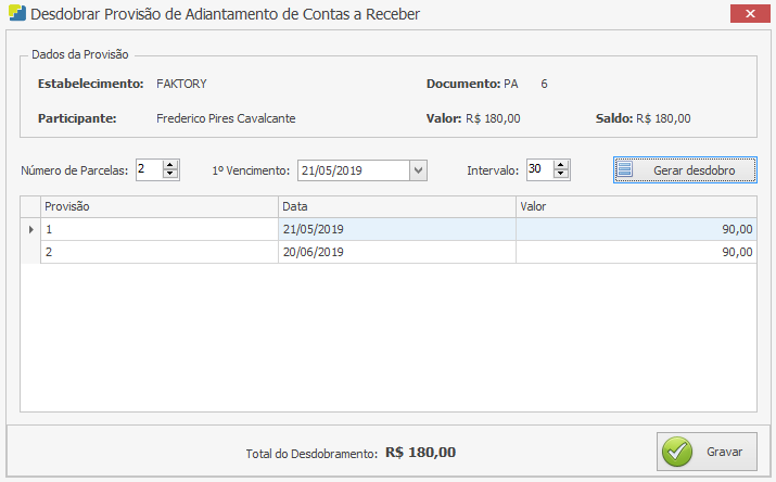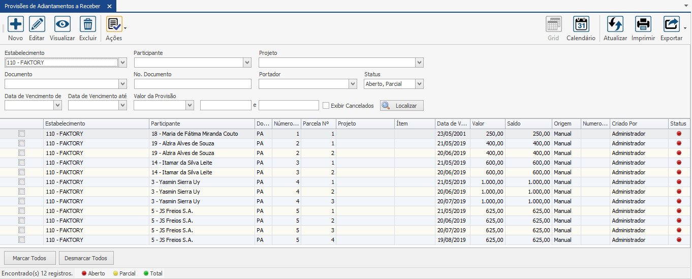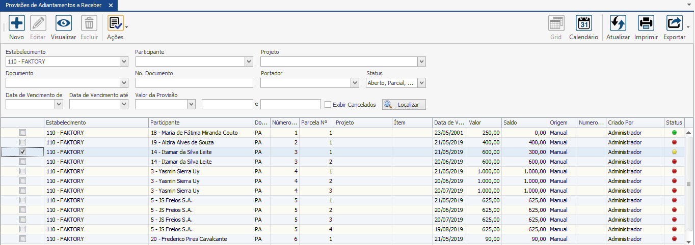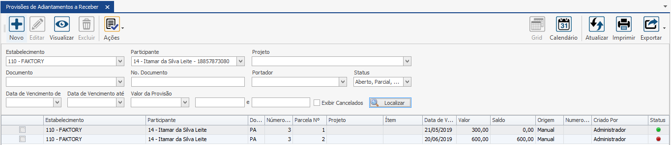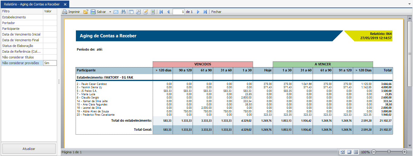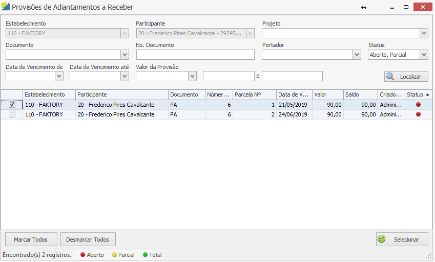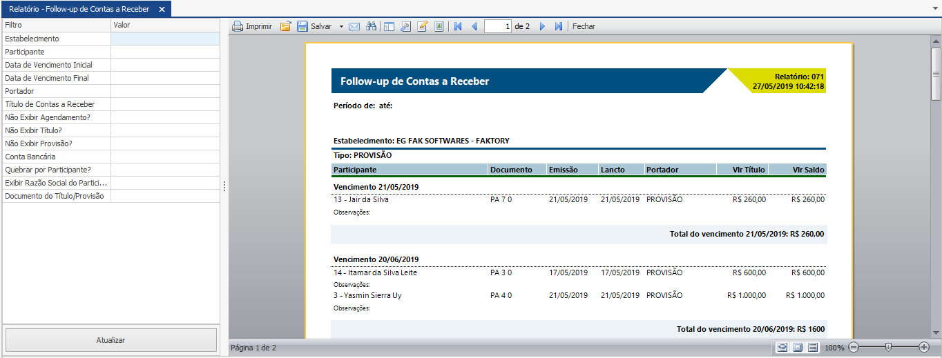 Veja abaixo um exemplo do relatório de “Recibo via Provisão a Receber” com o filtro “Participante” selecionado.