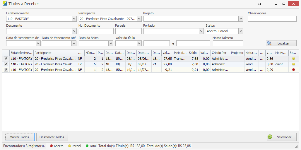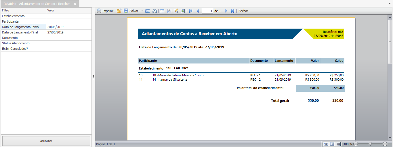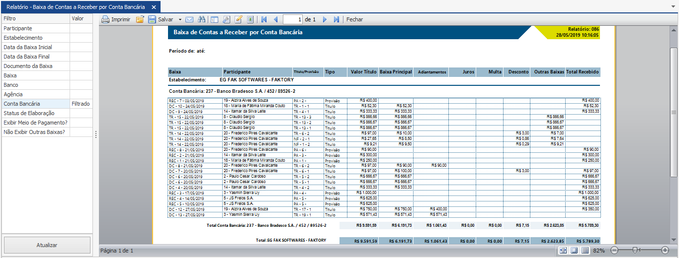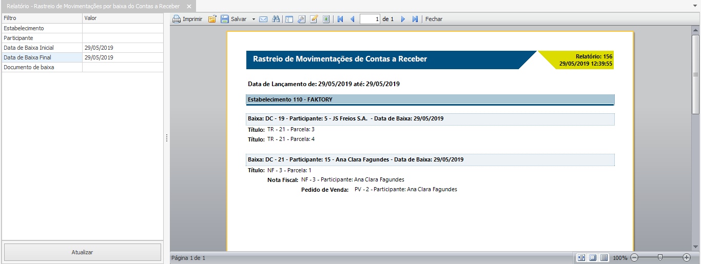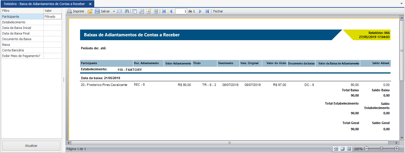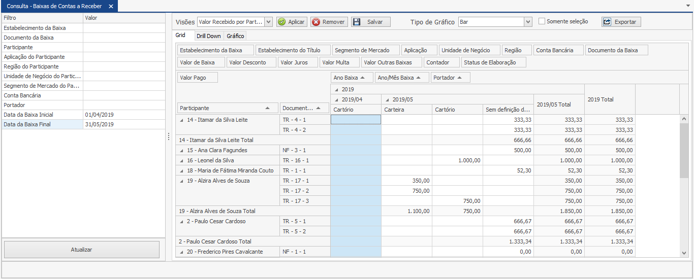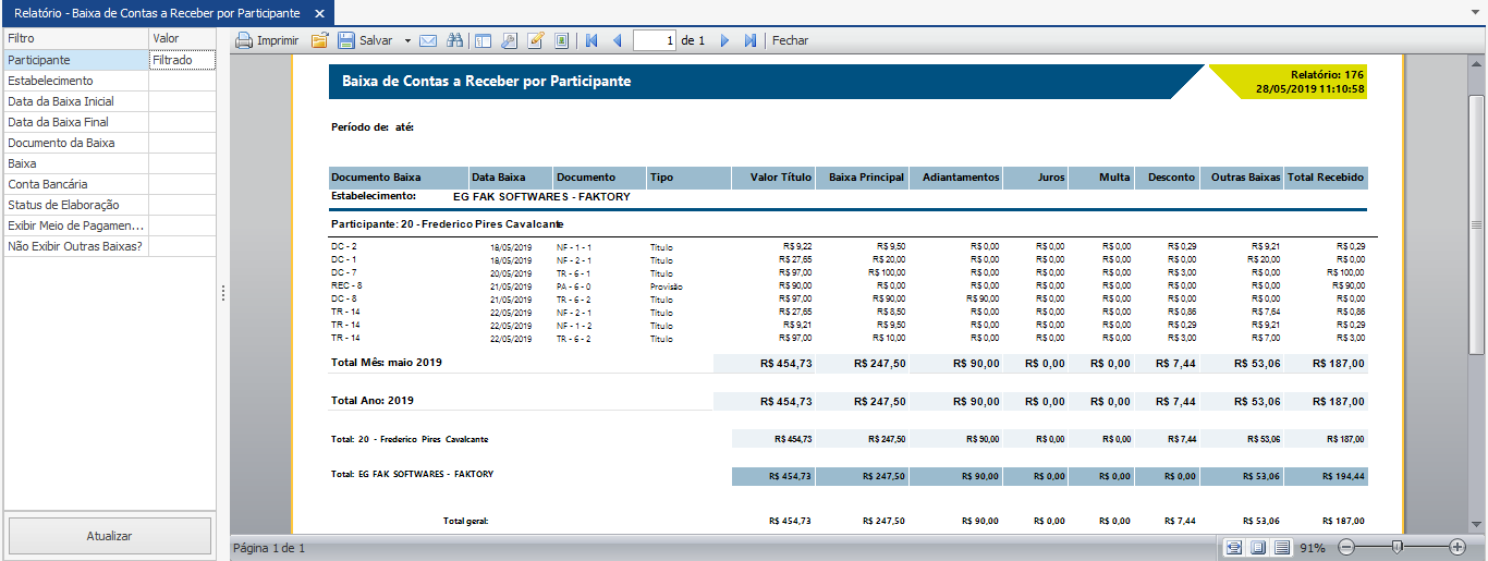 Veja abaixo um exemplo do relatório de “Baixa de Contas a Receber por Participante” com o filtro “Participante” selecionado.