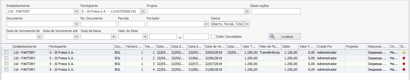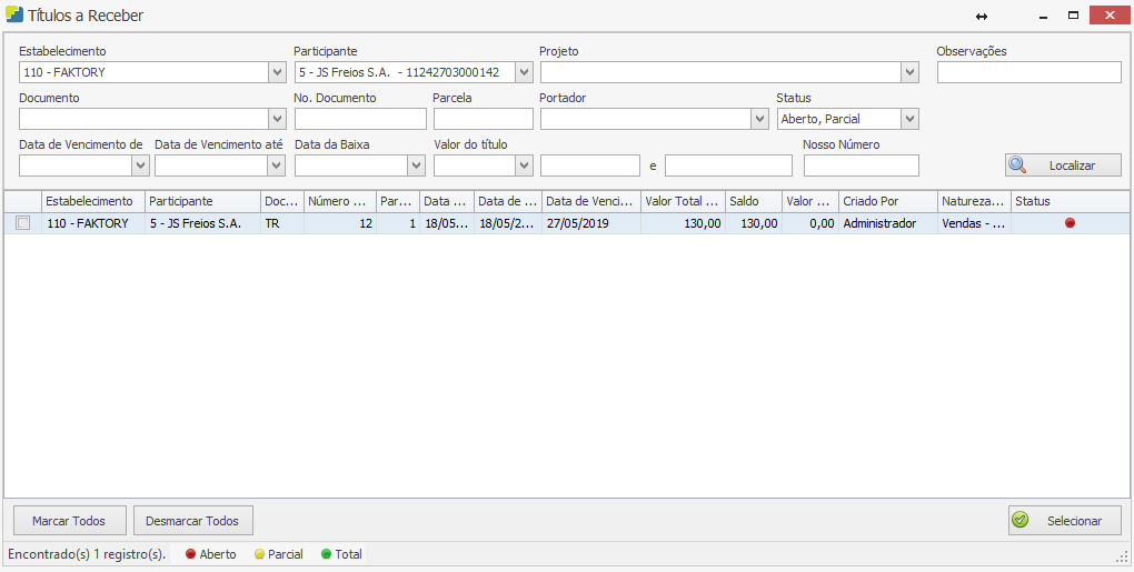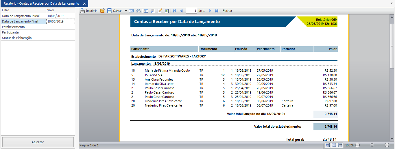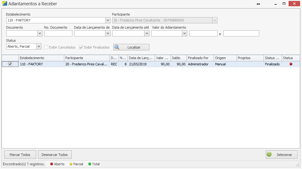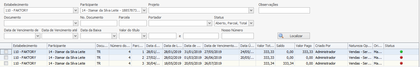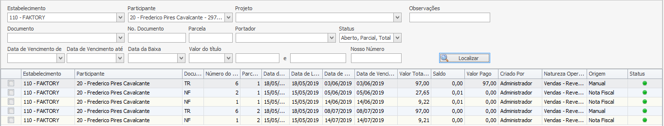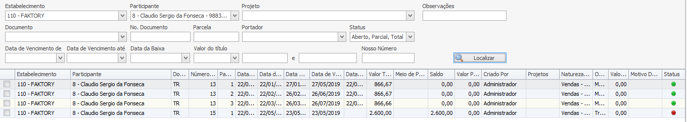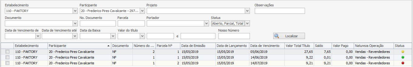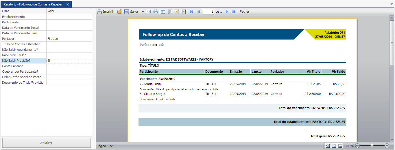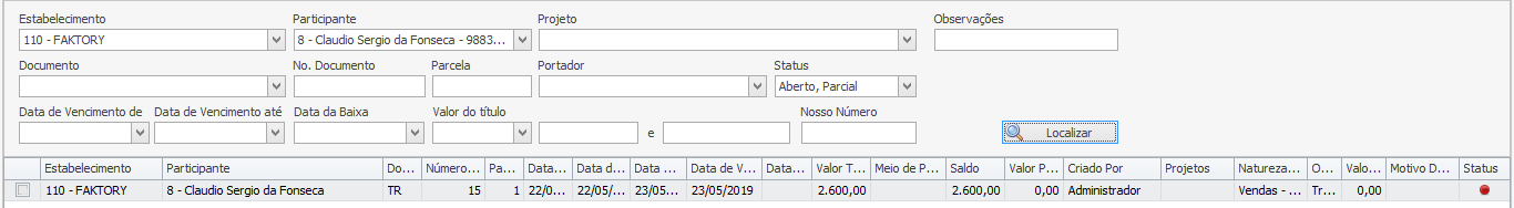 Veja abaixo um exemplo do relatório de “Baixa de Contas a Receber por Participante” com o filtro “Participante” selecionado.