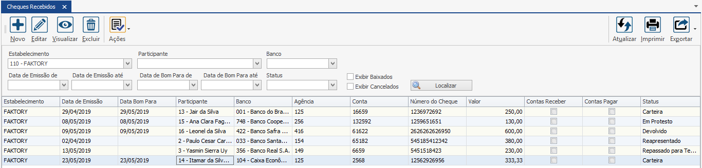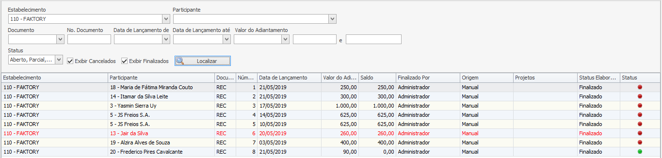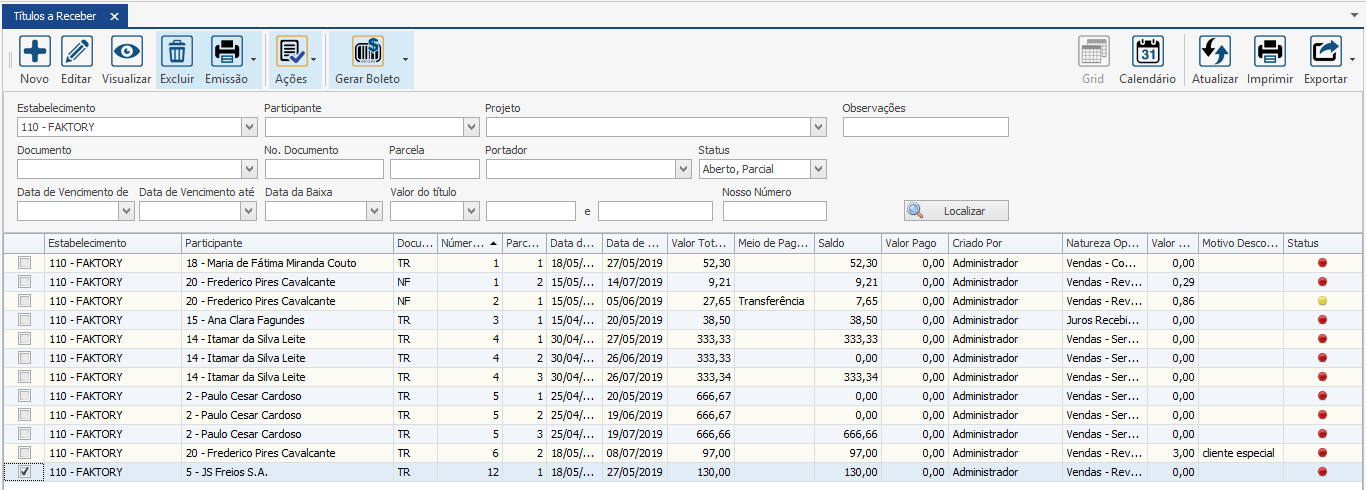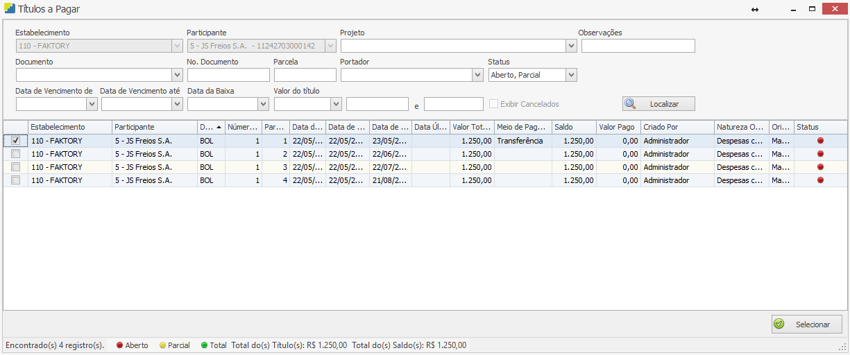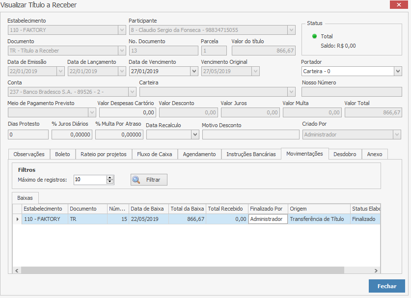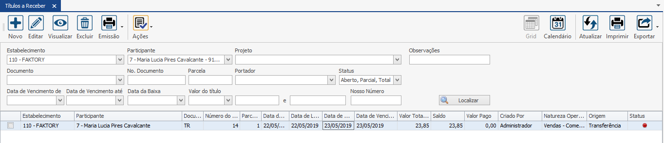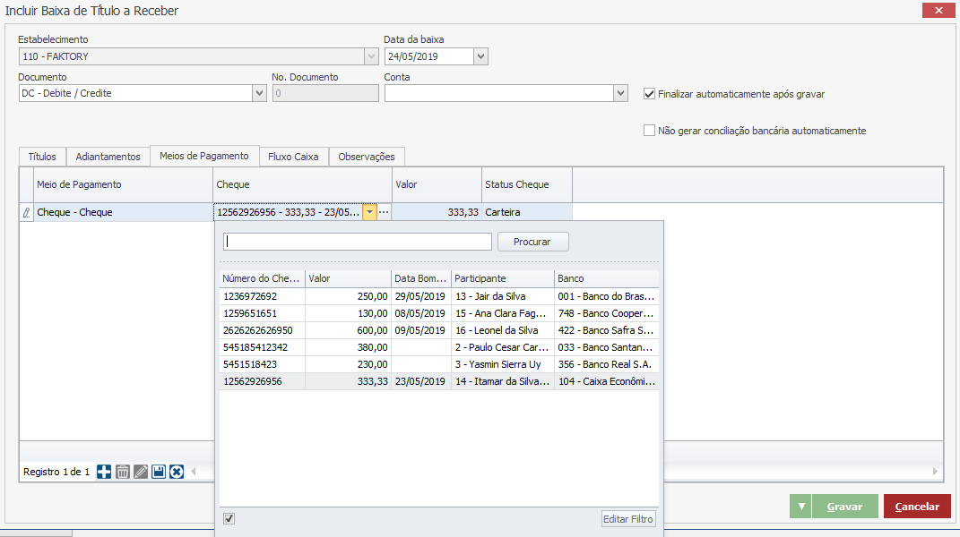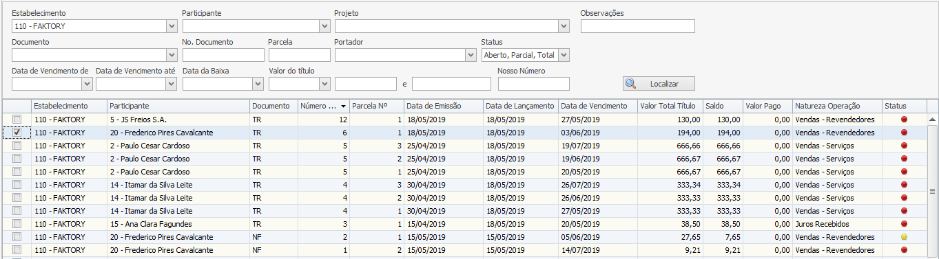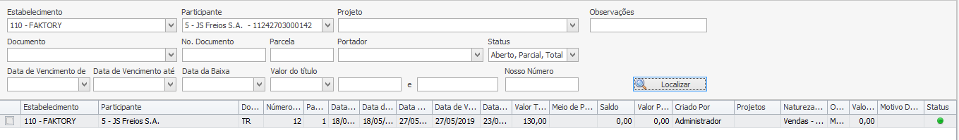 Veja abaixo um exemplo do relatório de “Baixa de Contas a Receber por Participante” com o filtro “Participante” selecionado.