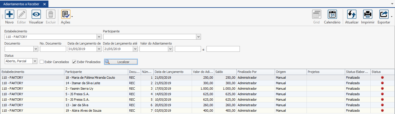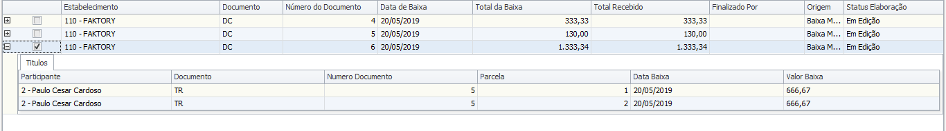 No relatório de “Baixa de Contas a Receber por Participante” encontra-se todas as baixas realizadas agrupadas por participante, dessa forma, é possível ter uma visão panorâmica e rápida de todas as baixas realizadas, e total recebido em nome de um cliente. Podemos observar as baixas provenientes de provisões de adiantamentos e de títulos. Este relatório proporciona uma análise rápida do montante de recebimento que cada cliente proporciona à empresa.