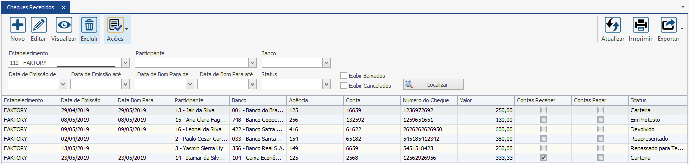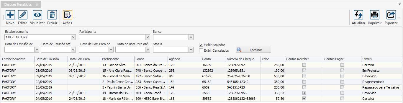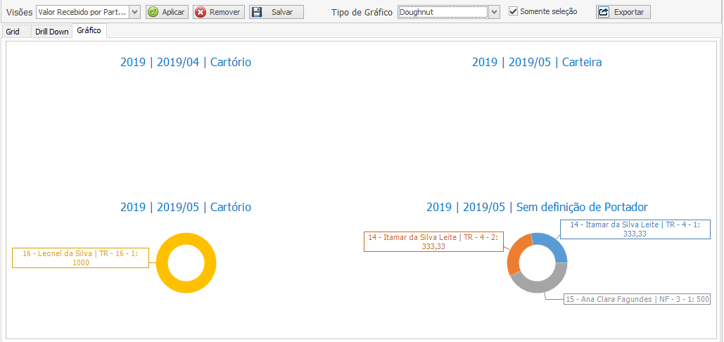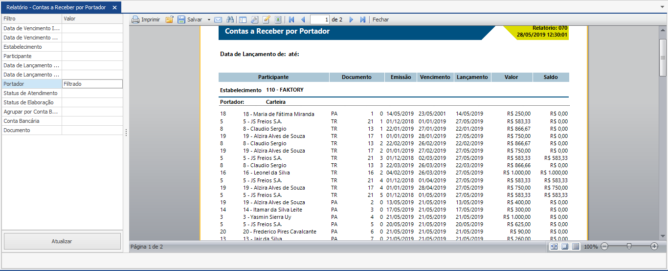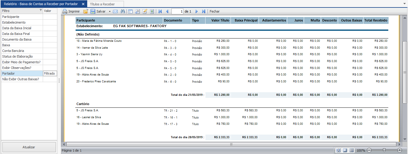 Veja abaixo um exemplo do relatório de “Baixa de Contas a Receber por Portador” com o filtro “Portador” selecionado.