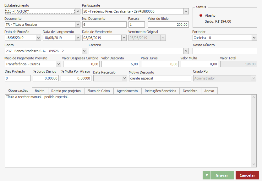 310 - Exige o preenchimento do motivo do desconto quando informado um valor para o campo desconto no Título a Receber. Quando marcado esse parâmetro o sistema não permite gravar um título a receber na qual foi informado um desconto, sem ser informado também, o motivo do desconto no campo “Motivo de Desconto. Em nossos exemplos a seguir o parâmetro está desmarcado.