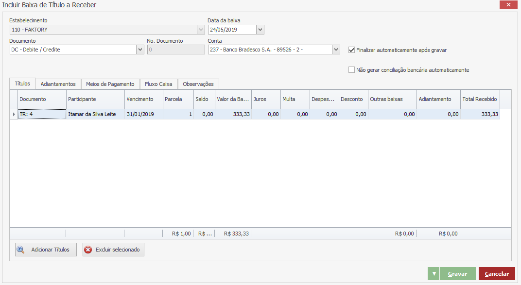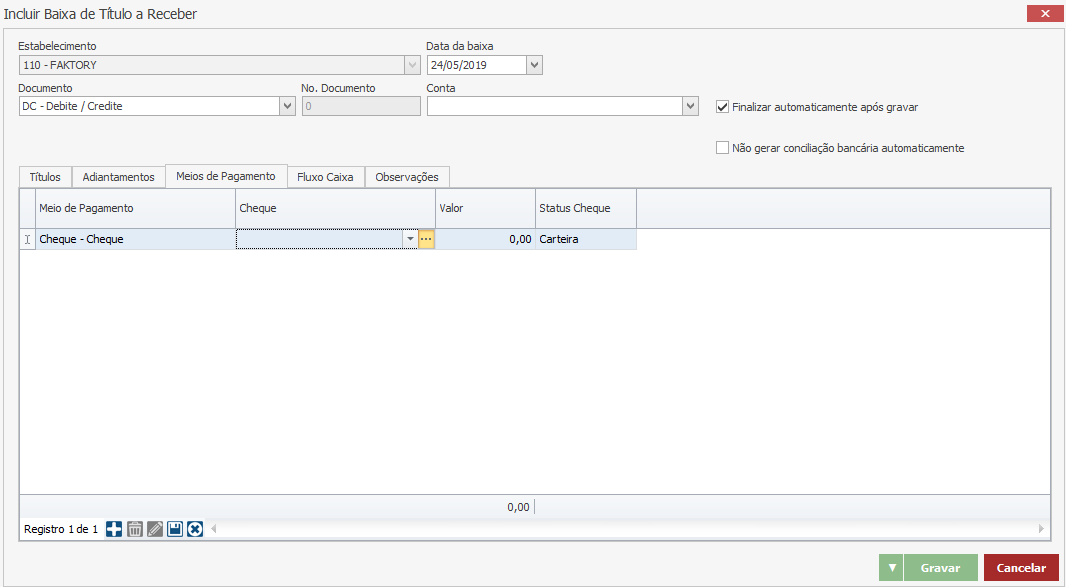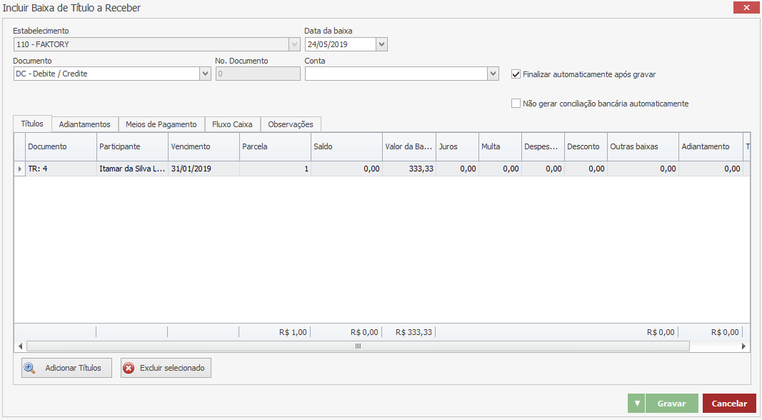 169 - Marcar a opção Finalizar Automaticamente na inclusão da baixa de título. Quando marcado esse parâmetro o sistema marca automaticamente a flag “Finalizar automaticamente após gravar” quando uma baixa é realizada, dessa forma, a baixa já é finalizada no momento da gravação da mesma; eliminando a necessidade de acessar a tela de “Baixa de Títulos” e clicar no botão “Ações” na opção “Finalizar”. Em nossos exemplos a seguir o parâmetro está marcado.