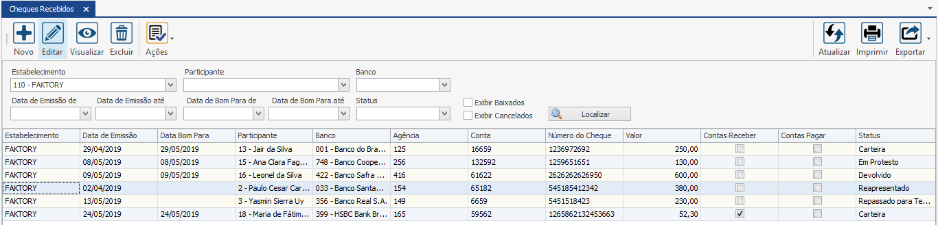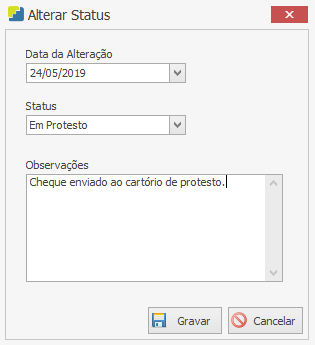 154 - Status padrão quando utilizado em Baixa de Títulos a Receber. Neste parâmetro deve ser informado o status padrão que será vinculado ao cheque após o mesmo ser utilizado como meio de pagamento em uma baixa de título a receber, ou seja, quando o cliente paga o título com um cheque. Em nossos exemplos abaixo utilizamos o status “Carteira”.