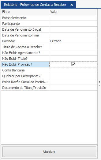 Título de Contas a Receber – Determina os títulos a receber que serão exibidos no relatório.
