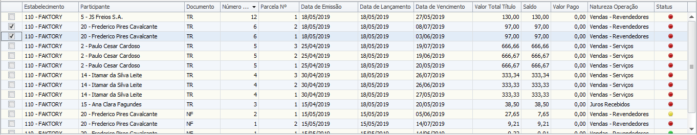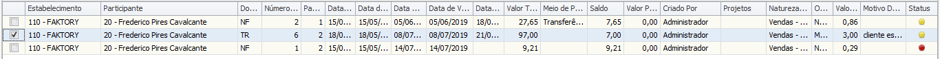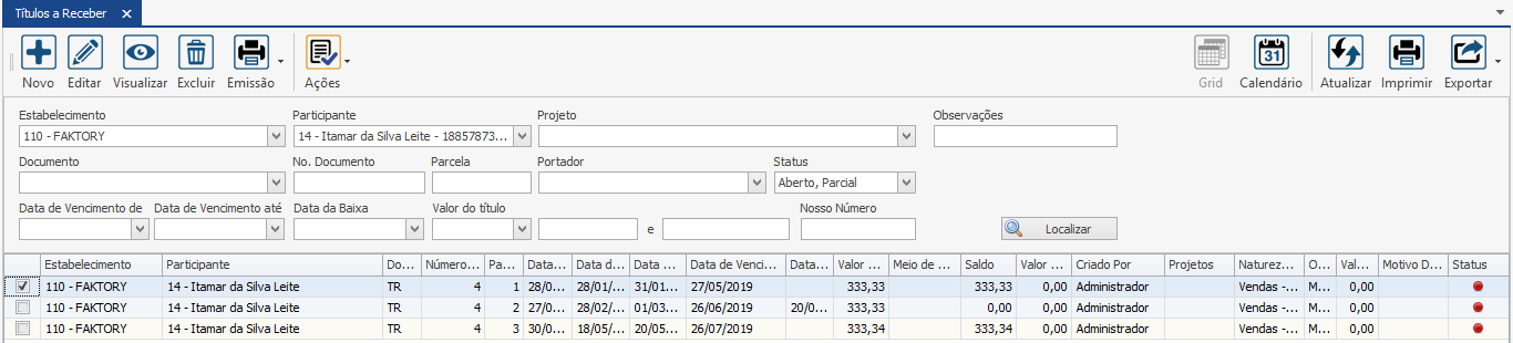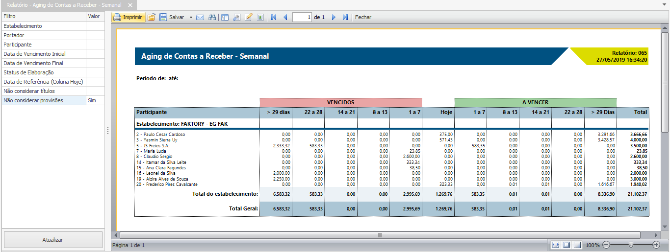 Veja abaixo um exemplo do relatório de “Posição Financeira do Participante – Receber" com o filtro “Participante” selecionado.