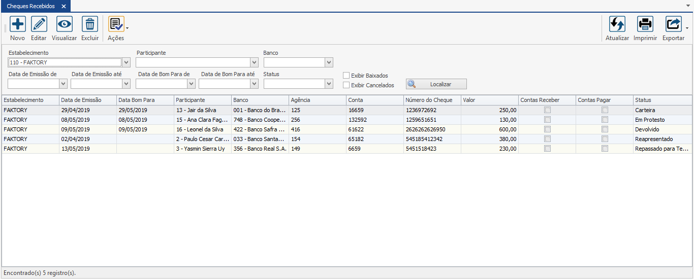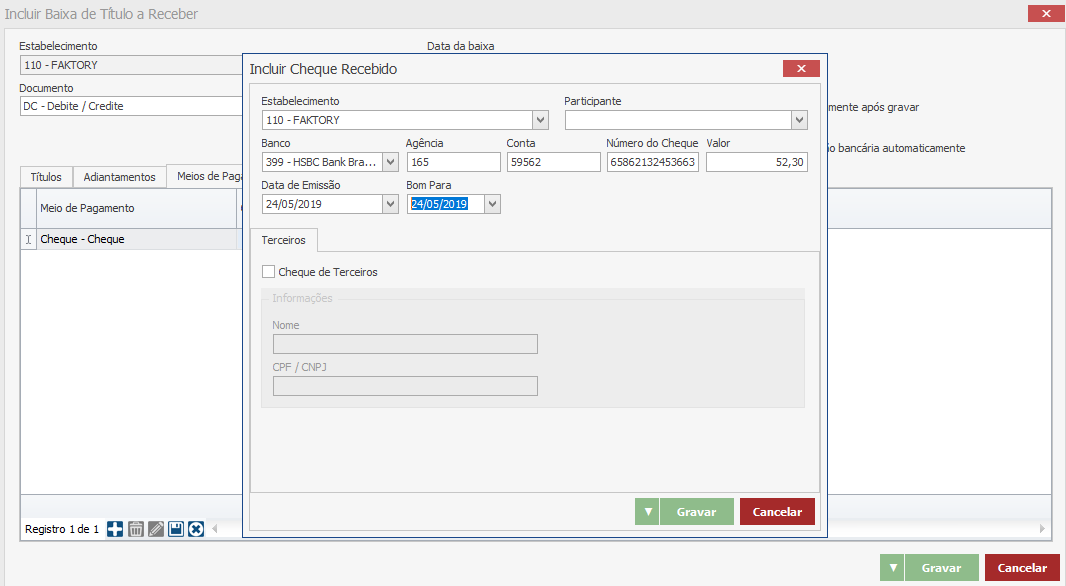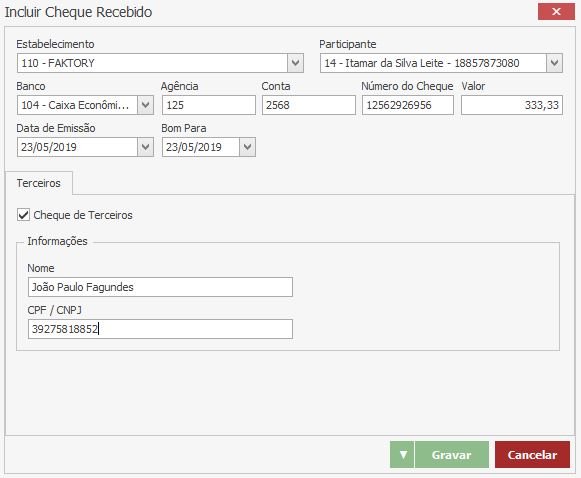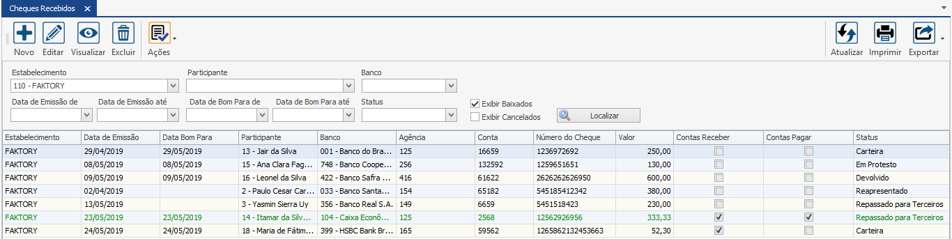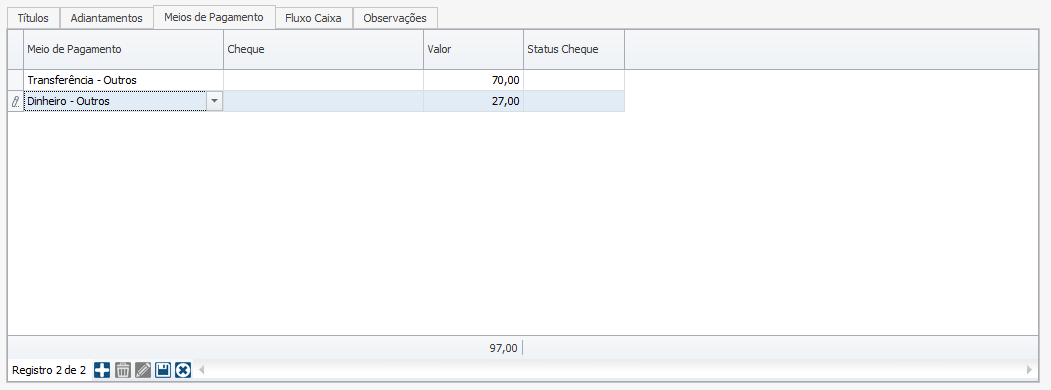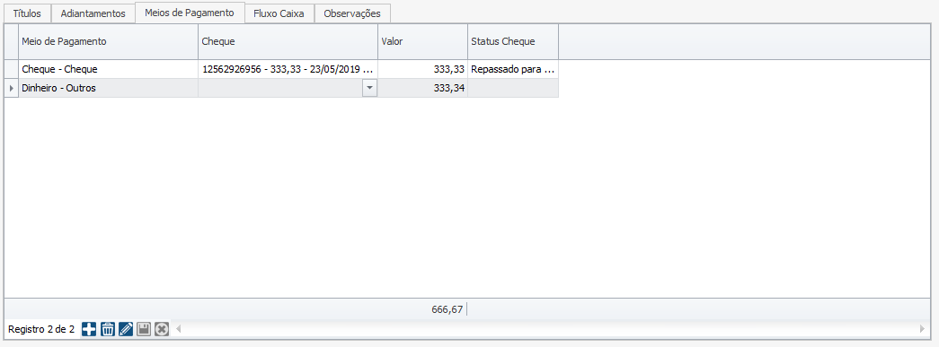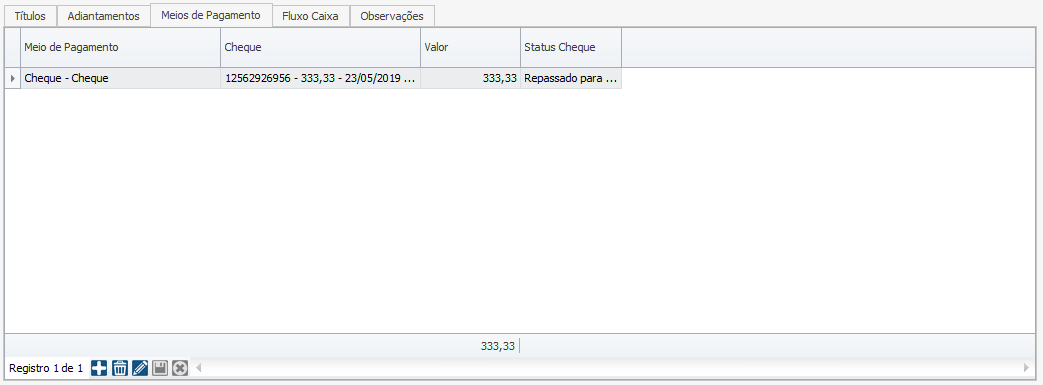 353 - Status padrão quando utilizado na finalização do Adiantamento a Pagar. Neste parâmetro deve ser informado o status padrão que será vinculado ao cheque após o mesmo ser utilizado como meio de pagamento em um adiantamento a pagar, ou seja, quando o cheque recebido de um cliente é utilizado para pagar adiantado um fornecedor. Em nossos exemplos abaixo utilizamos o status “Repassado para Terceiros”.