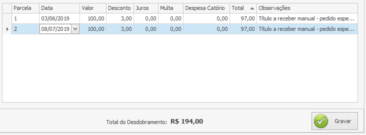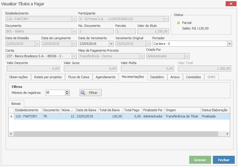 311 - Exige o preenchimento da Observação na baixa dos Títulos Pagar e Receber quando informado um valor nos campos outras baixas ou desconto. Quando marcado esse parâmetro o sistema não permite gravar uma baixa de título na qual foi realizada uma baixa do tipo “outras baixas”, sem ser informado também, alguma descrição no campo “Observação”. Em nossos exemplos a seguir o parâmetro está desmarcado.