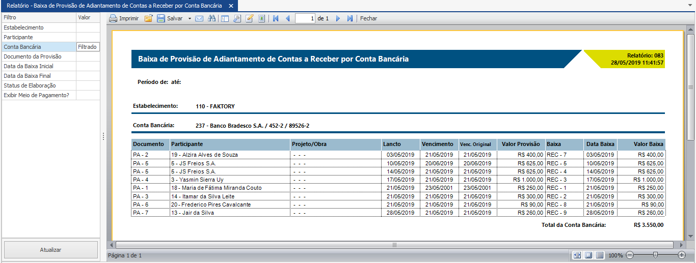 Veja abaixo um exemplo do relatório de “Baixa de Provisão de Adiantamento de Contas a Receber por Conta Bancária” com o filtro “Conta Bancária” selecionado.