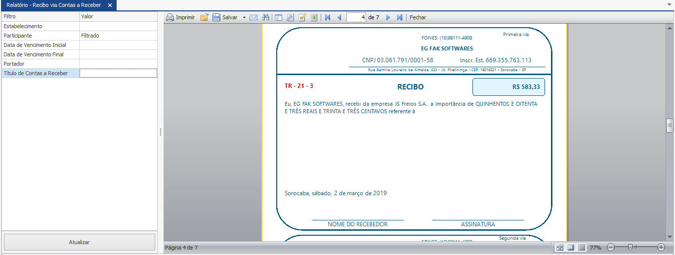 No relatório de “Recibo via Contas a Receber” encontra-se todos os títulos a receber lançados no sistema em forma de recibo de pagamento, que pode ser impresso e assinado, em seguida, entregue ao cliente como forma de comprovante de pagamento. O relatório permite agrupar por participante ou até selecionar uma provisão específica.
