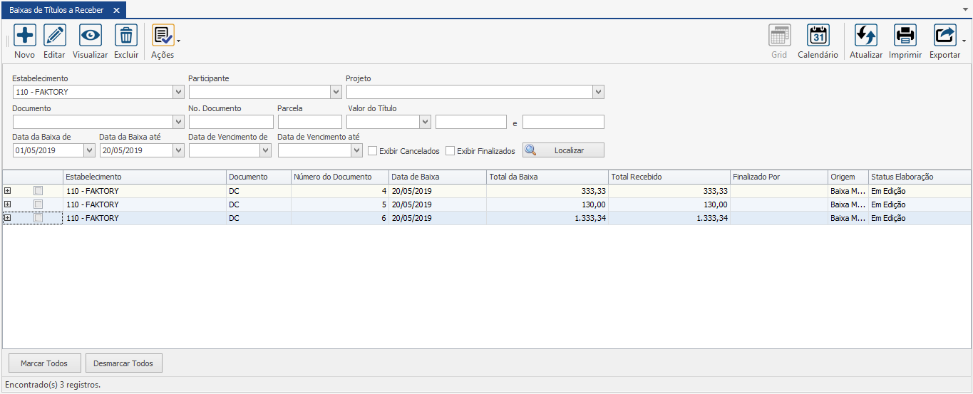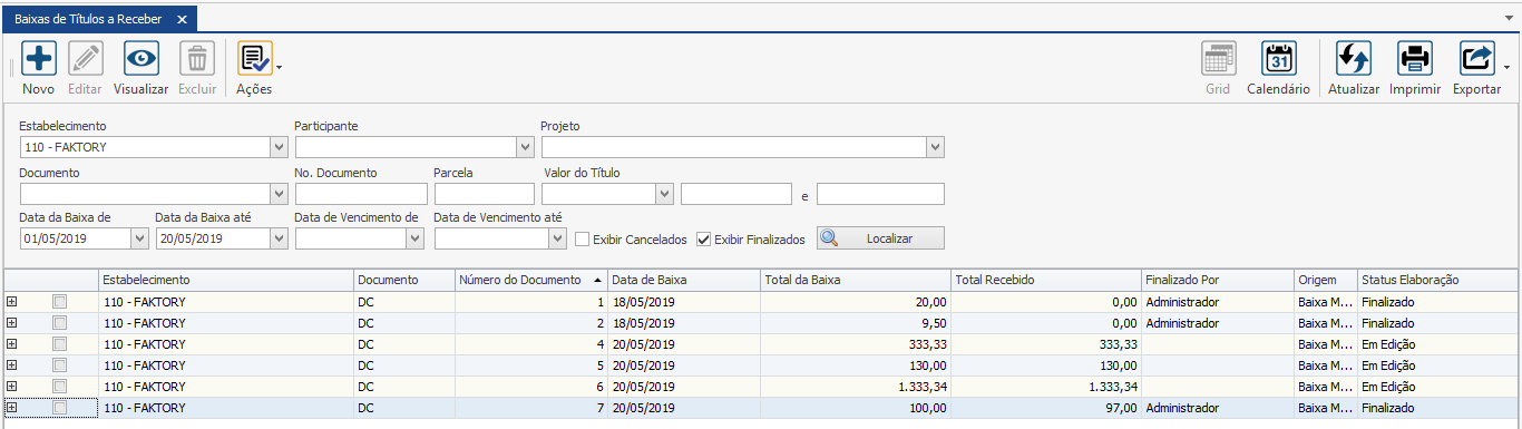 Veja abaixo um exemplo do relatório de “Baixa de Contas a Receber por Documento” com o filtro “Baixa” selecionado.