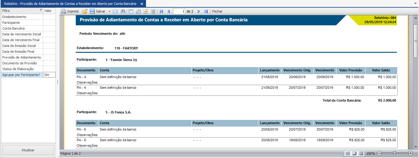 Veja abaixo um exemplo do relatório de “Provisão de Adiantamento de Contas a Receber em Aberto por Conta Bancária” com o filtro “Agrupar por Participante?” selecionado.