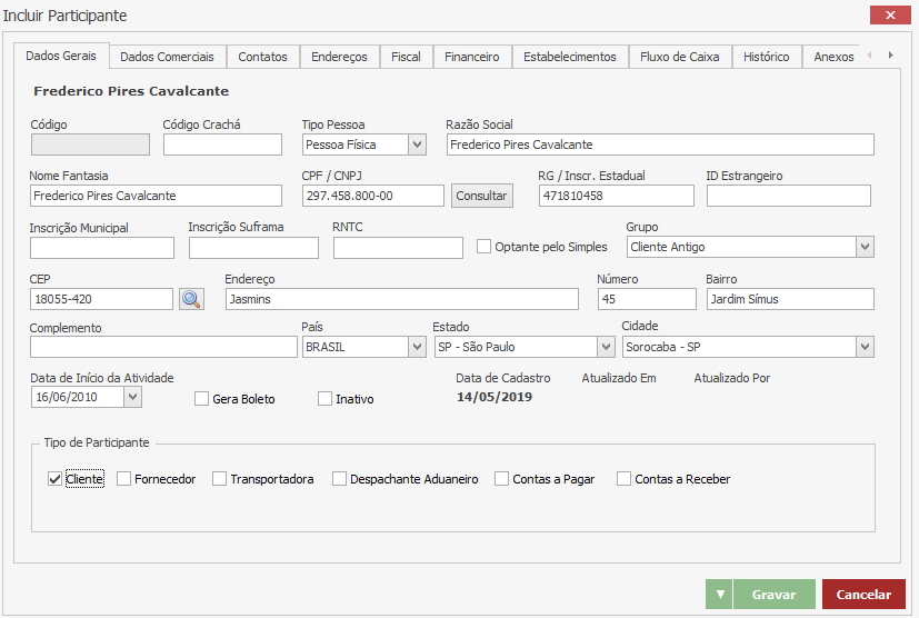 A tela de cadastro de participante é dividida em abas. Vejamos adiante como preencher cada campo. Neste nosso exemplo cadastramos um participante do tipo cliente.