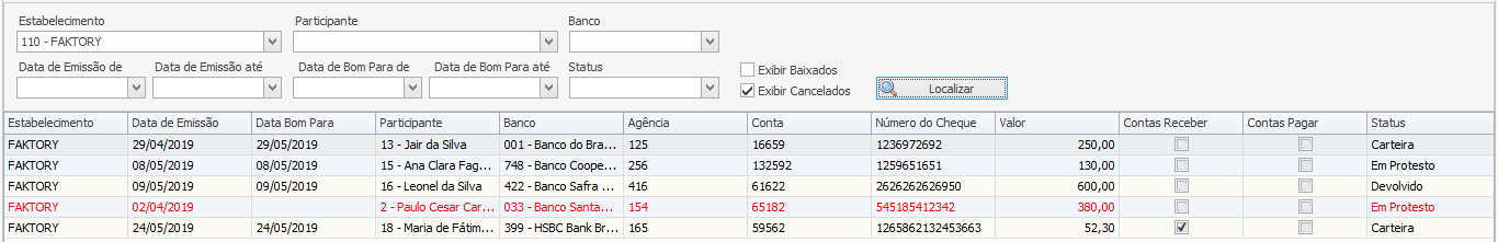 109 - Status padrão para Contas a Pagar cancelada com cheque vinculado. Neste parâmetro deve ser informado o status padrão que será vinculado ao cheque após a baixa do título a pagar, na qual o cheque estava vinculado, tenha sido cancelada; no caso em que o fornecedor devolver o cheque por algum motivo. Em nossos exemplos abaixo utilizamos o status “Devolvido”.