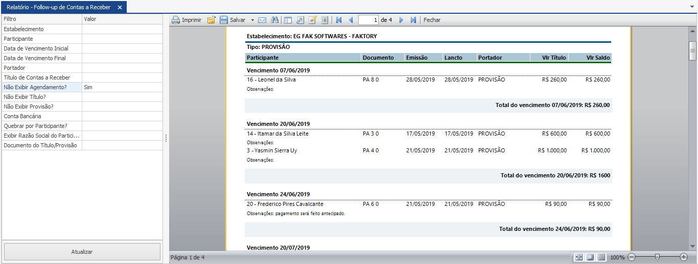 No relatório de “Follow-up de Contas a Receber” encontra-se os títulos e provisões em aberto, agrupados pela data de vencimento em ordem crescente. O relatório possibilita uma análise panorâmica das provisões e títulos a receber e também pode ser agrupado por participantes, facilitando assim o gerenciamento dos recebíveis da empresa. Este relatório pode facilitar no checklist para conferência de recebimentos que a empresa tem em aberto há um tempo e aqueles que ainda estão com vencimento futuro.