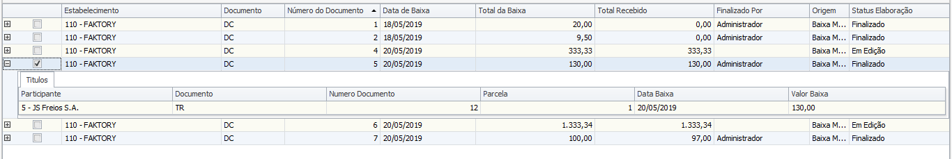 No relatório de “Baixa de Contas a Receber por Documento” encontra-se todas as baixas realizadas agrupadas por documento utilizado na baixa, dessa forma, é possível ter uma visão detalhada de todas as baixas realizadas, e total recebido por documento. Podemos observar as baixas provenientes de provisões de adiantamentos e de títulos. Este relatório permite a visualização de todas os títulos ou provisões que compõem uma mesma baixa, dessa forma é possível analisar detalhadamente as baixas agrupadas.