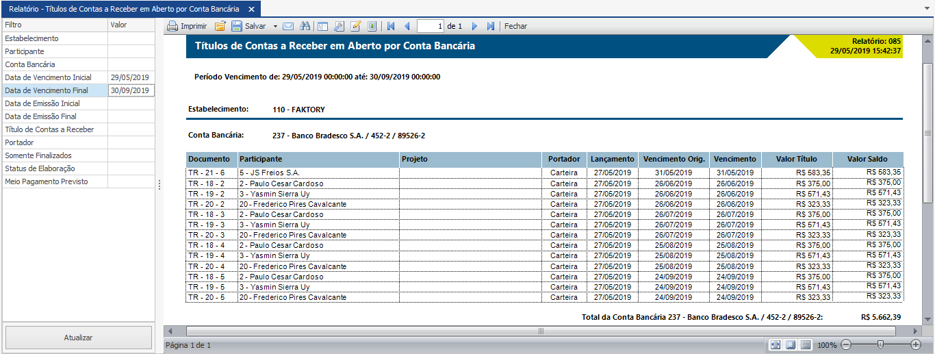Veja abaixo um exemplo do relatório de “Títulos de Contas a Receber em Aberto por Conta Bancária” com os filtros “Data de Vencimento Inicial” e “Data de Vencimento Final” selecionados.