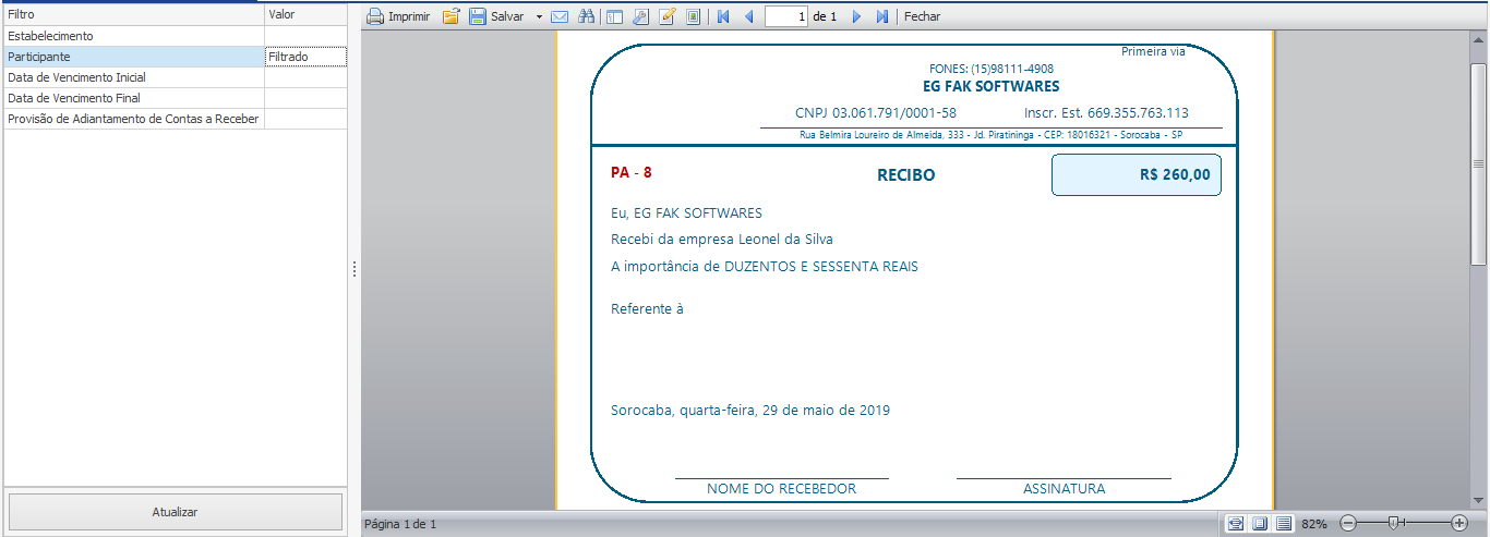 Veja abaixo um exemplo do relatório de “Recibo via Contas a Receber” com o filtro “Participante” selecionado.