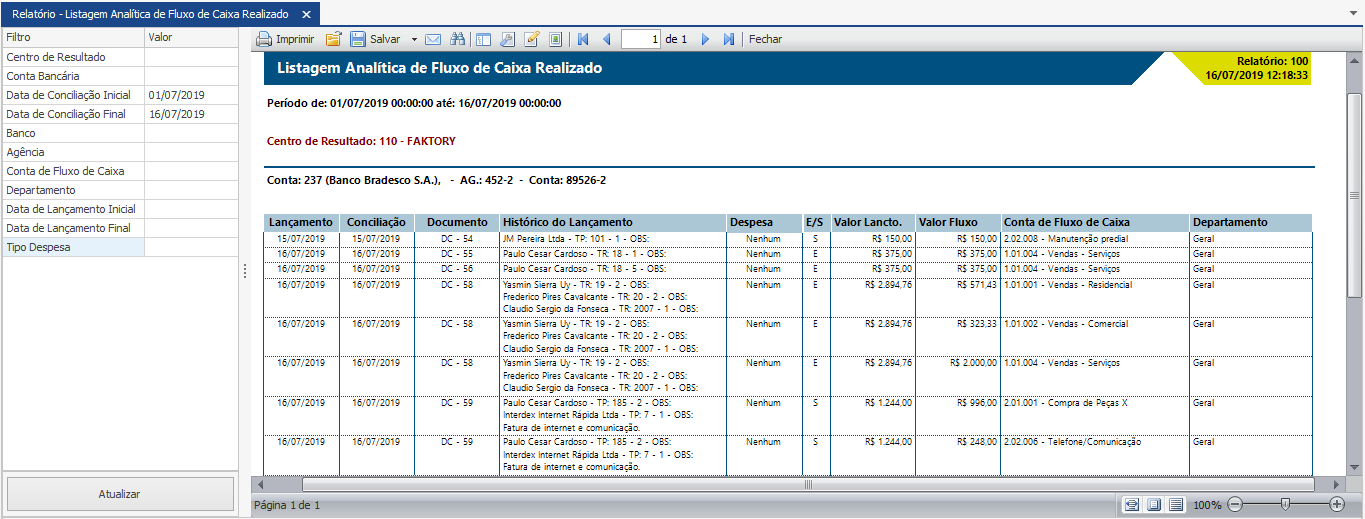 Veja abaixo um exemplo do relatório Listagem Analítica de Fluxo de Caixa Realizado com os filtros “Data de Conciliação Inicial e Final” selecionados.