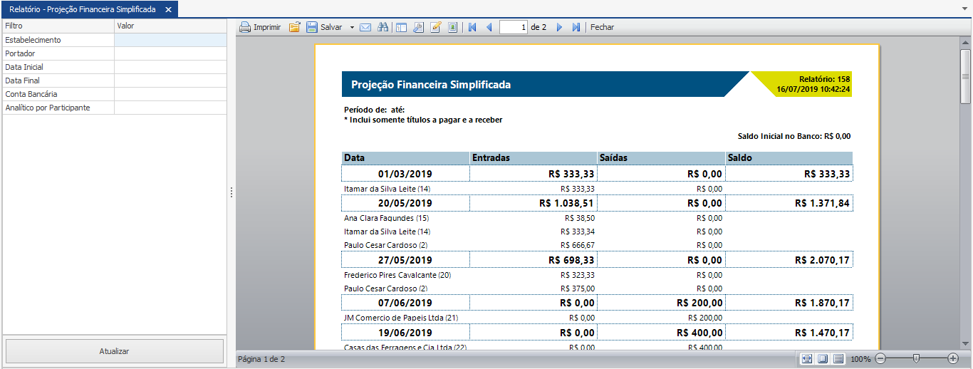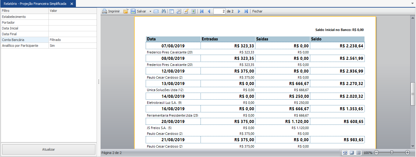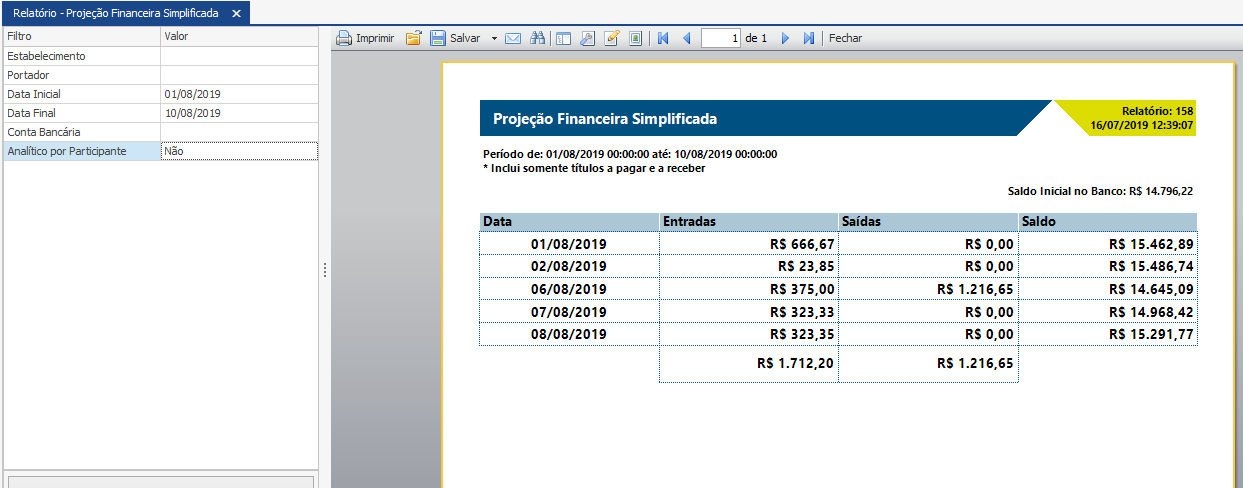O relatório de Projeção Financeira Simplificada traz o fluxo de caixa previsto classificado por data, somando as futuras entradas e saídas dor dia. Para auxiliar o usuário a entender a composição dos valores, o relatório traz a opção de mostrar o nome do participante. Este relatório inclui somente os títulos a pagar e a receber. Dessa forma, proporciona ao gestor uma visão panorâmica e confiável dos valores que irão entrar e sair do caixa nos próximos dias.