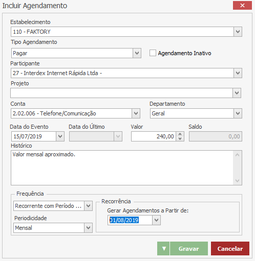 Periodicidade – informe a intermitência das movimentações financeiras. Em nosso exemplo selecionamos a opção mensal, pois esta despesa ocorre uma vez por mês.