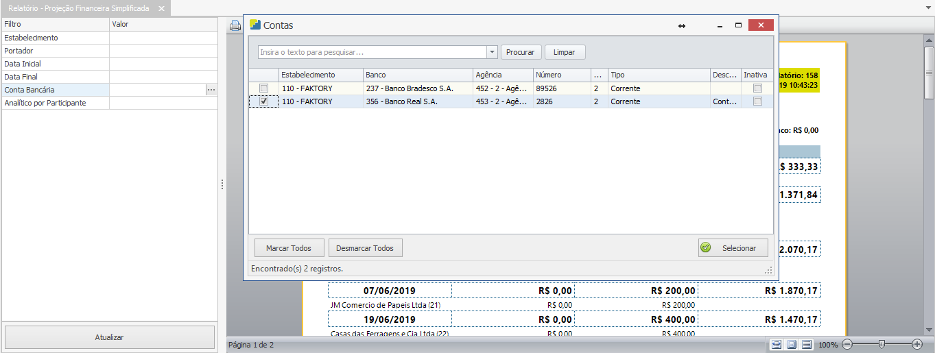 Veja abaixo um exemplo do relatório de Projeção Financeira Simplificada com os filtros “Data Inicial e Final” selecionados.