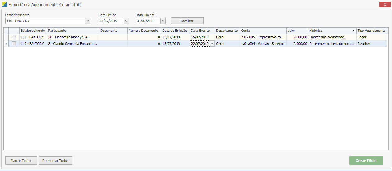 Logo após, marque com a flag na caixa de seleção os agendamentos que irão gerar os títulos, em nosso exemplo iremos marcar os dois agendamentos, em seguida clique no botão “Gerar Título”. Veja exemplo abaixo: