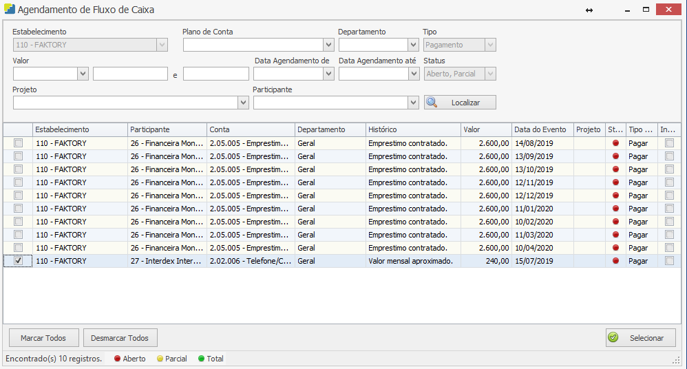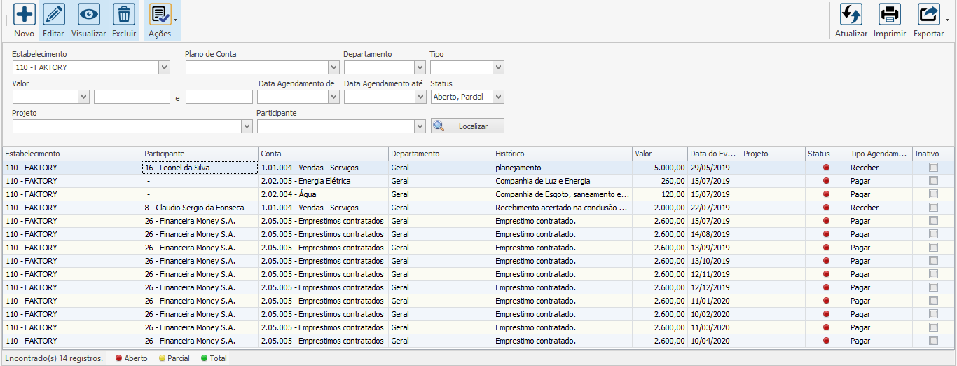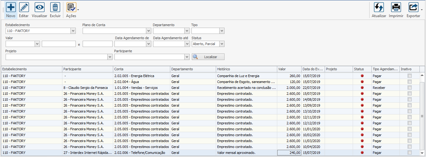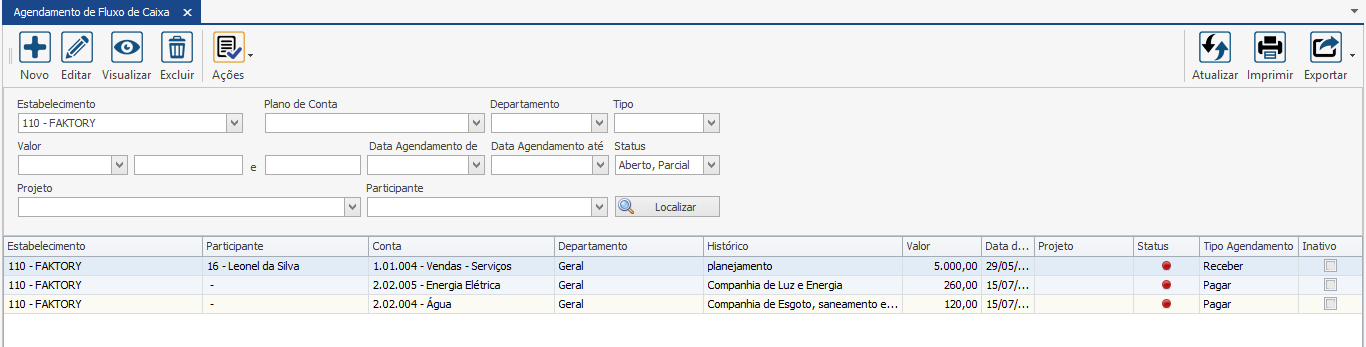 Note que na grid apareceram os dois primeiros agendamentos criados anteriormente, sendo um a pagar e o outro a receber.