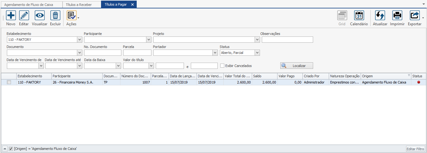 Note que o título a receber foi criado. Agora acesse o menu Financeiro > Contas a Pagar > Títulos e filtre da mesma maneira, para visualizarmos o título a pagar gerado também via agendamento de fluxo de caixa. Veja imagem abaixo: