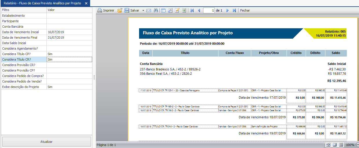 Veja abaixo um exemplo do relatório de Fluxo de Caixa Previsto Analítico por Projeto com os filtros “Data de Vencimento Inicial e Final”, “Considerar Título CP?”, “Considerar Título CR?” e “Exibir descrição do projeto” selecionados.