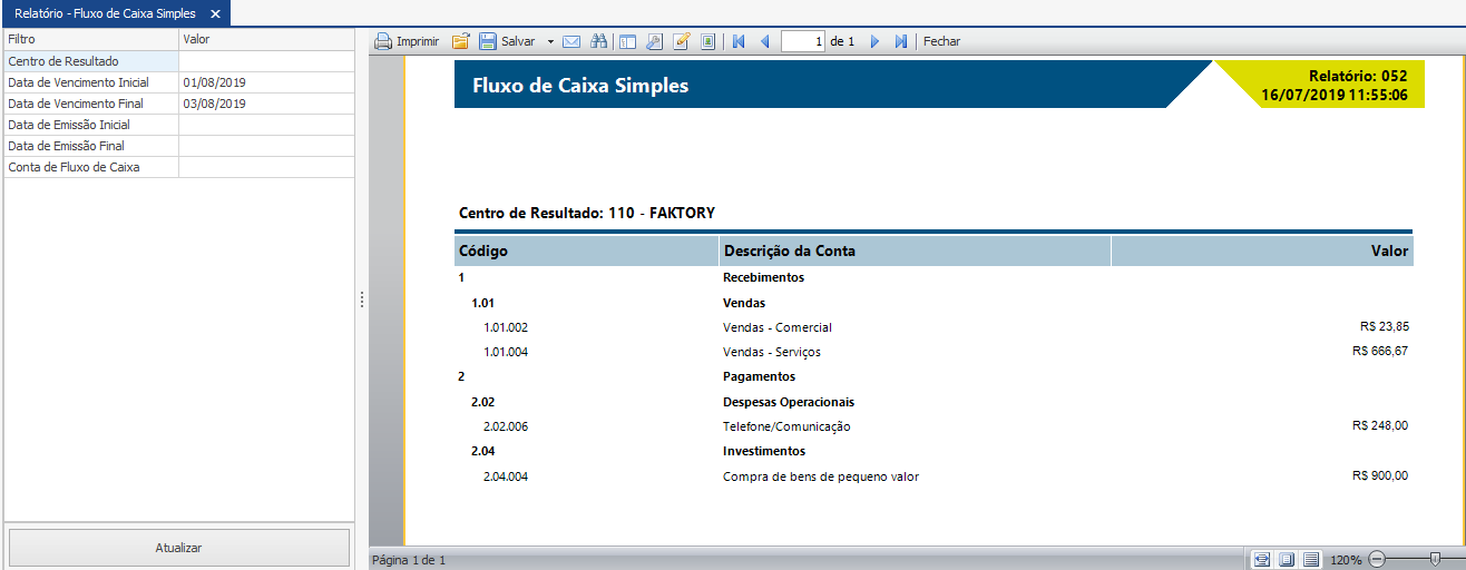 Veja abaixo um exemplo do relatório de Fluxo de Caixa Simples com os filtros “Data de Vencimento Inicial e Final” selecionados.