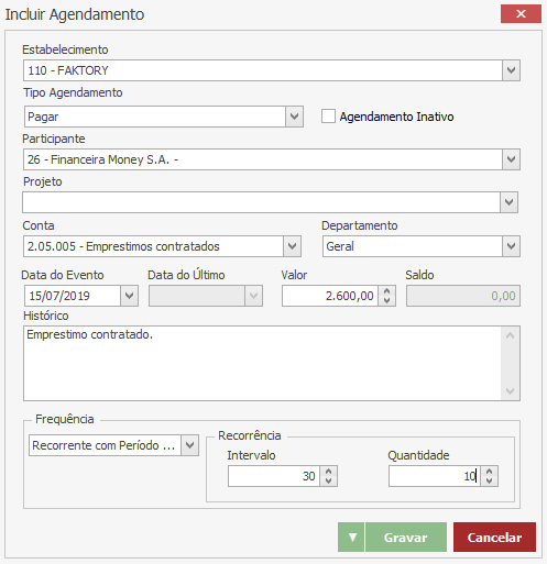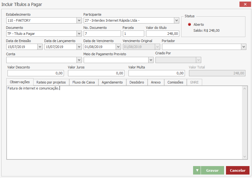 Note que o agendamento do fluxo e caixa se encontra na grid da aba Agendamento, no valor de R$240,00, no entanto, o valor do título que está sendo lançado está um pouco maior, no valor de R$248,00. Isso ocorre, pois o agendamento de fluxo de caixa se trata de uma previsão aproximada, já o lançamento do título trata-se da fatura de fato que chegou ao estabelecimento. A partir da criação do título, o valor que será levado em consideração no fluxo de caixa previsto para o mês que houve esse lançamento, é o valor de R$248,00, ou seja, o valor da fatura que de fato chegou ao estabelecimento.