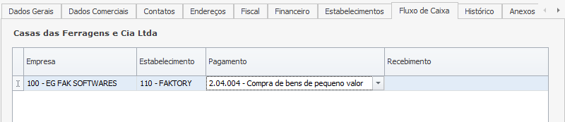 452 - Obrigar conta fluxo caixa pagamento no cadastro de fornecedor. Quando marcado este parâmetro o sistema obriga o usuário a informar uma conta de fluxo de caixa ao realizar um cadastro de um participante do tipo fornecedor. Em nossos exemplos a seguir o parâmetro está marcado.