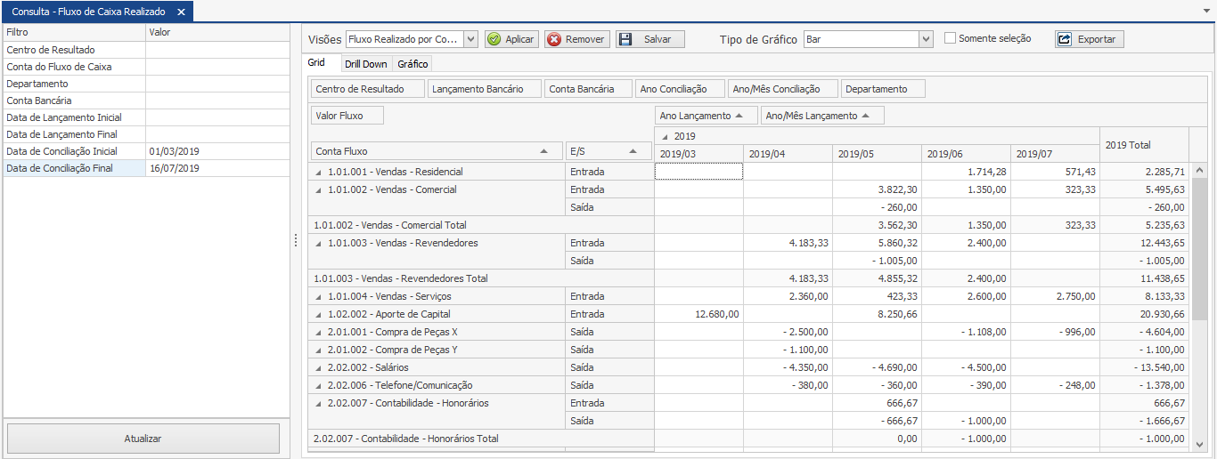 Neste exemplo acima, foi selecionada a visão “Fluxo Realizado por Conta” e o item de dados “E/S” foi arrastado para visualização em coluna da consulta.