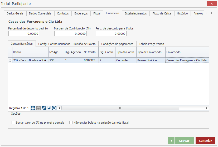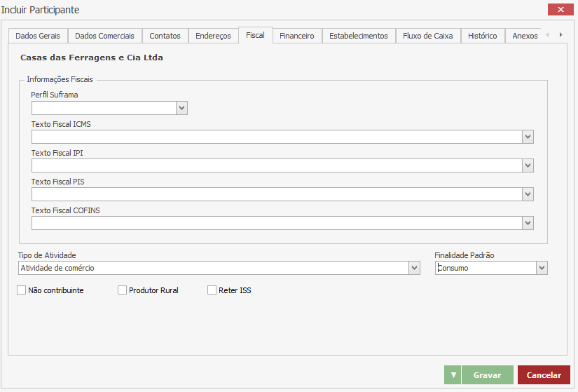 Flag Inativo – Marque essa flag somente nos casos em que o participante não deve ser mais selecionado em nenhuma movimentação do sistema. Este participante estará bloqueado para qualquer lançamento ou movimentação no sistema.