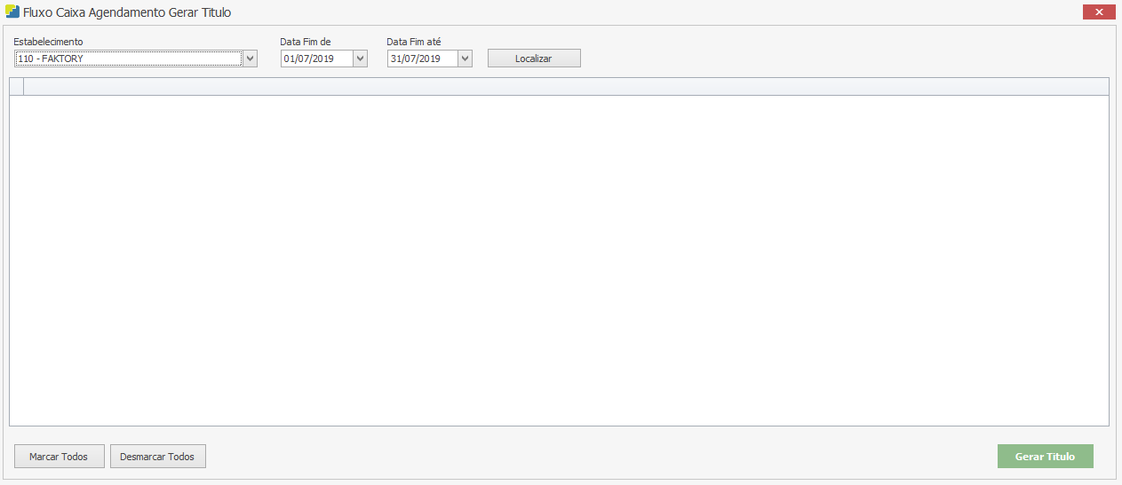 Para gerar os títulos, selecione o estabelecimento desejado. Em seguida selecione o período dos agendamentos. Neste nosso exemplo, informamos a data inicial de 01/07/2019 e data final 31/07/2019. Logo, o sistema irá trazer na grid abaixo os agendamentos entre essas datas. Em seguida, clique no botão “Localizar”. Veja exemplo abaixo: