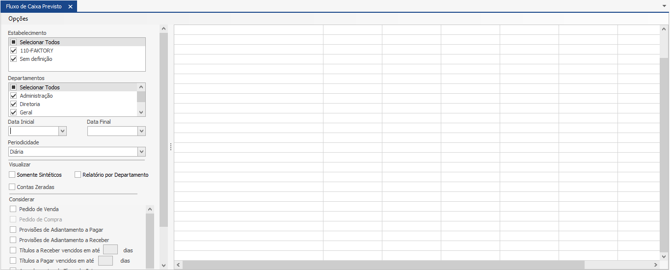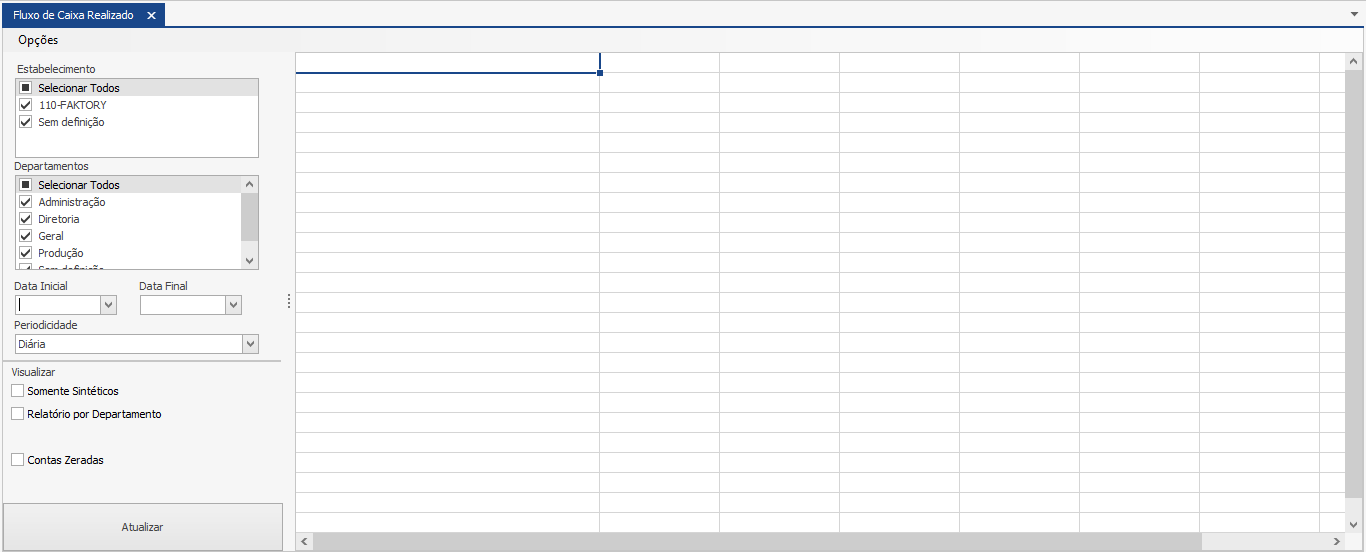Neste nosso exemplo abaixo veremos um exemplo de consulta de Fluxo de Caixa Realizado. Veja abaixo a tela inicial da consulta.