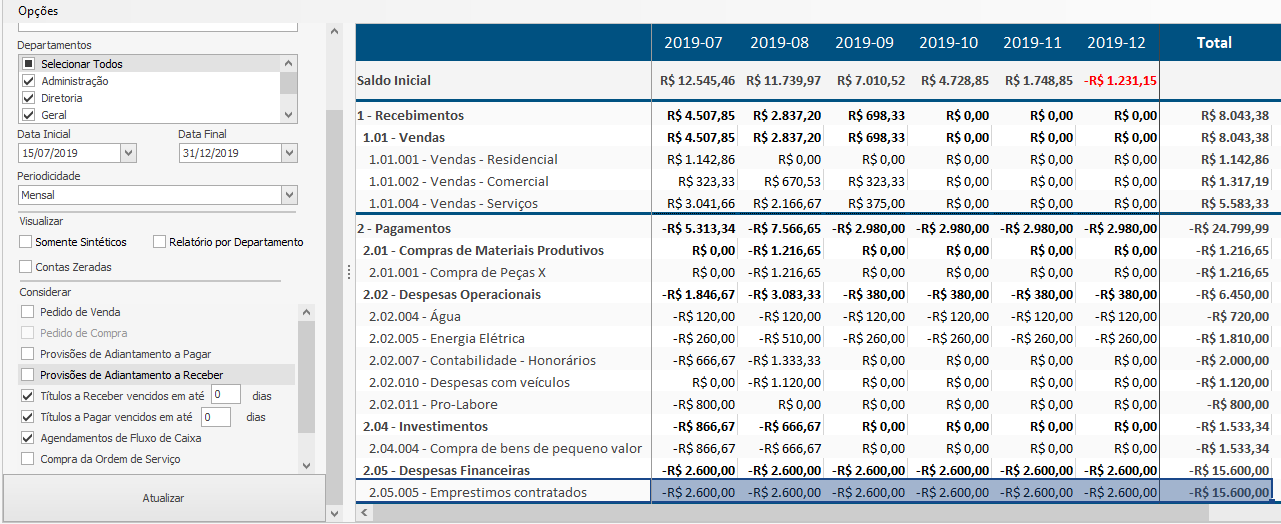 Para confirmar que no mês de agosto o valor previsto da conta Telefone/Comunicação foi alterado, levando em consideração o título criado, e não houve a duplicação dos lançamentos, acesse o menu Financeiro > Fluxo de Caixa > Fluxo de Caixa Previsto. Consulte novamente o fluxo de caixa previsto do período 01/08/2019 a 31/12/2019, conforme exemplo abaixo: