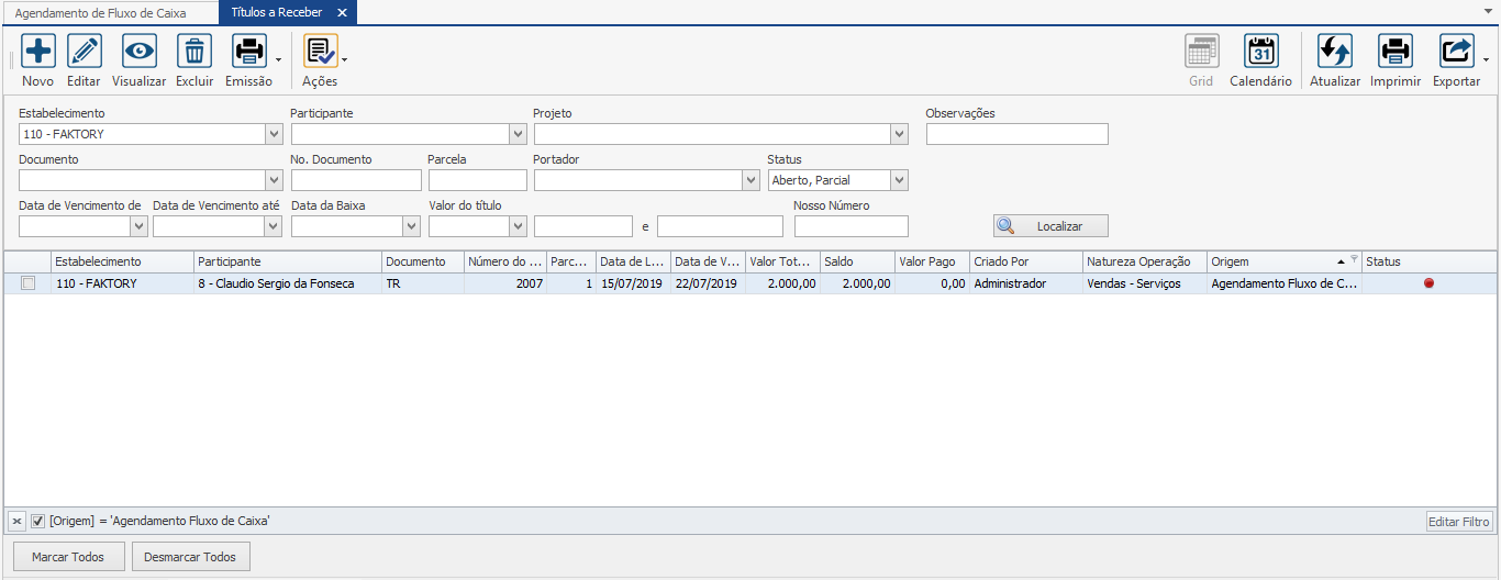Pronto! os títulos foram gerados. Para confirma a criação dos títulos, acesse o menu Financeiro > Contas a Receber > Títulos. Filtre o título desejado. Neste nosso exemplo, filtramos pela coluna “Origem”, para aparecer na tela somente os títulos gerados através de agendamento de fluxo de caixa. Veja imagem abaixo: