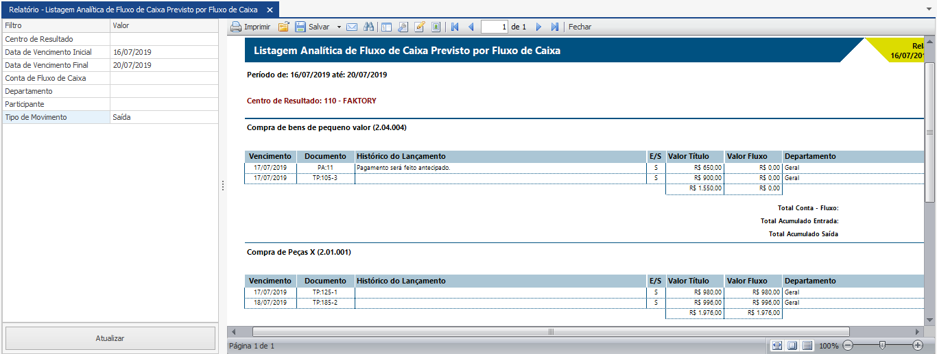 Veja abaixo um exemplo do relatório de Listagem Analítica de Fluxo de Caixa Previsto por Fluxo de Caixa com os filtros “Data de Vencimento Inicial e Final” e “Tipo de Movimento” selecionados.