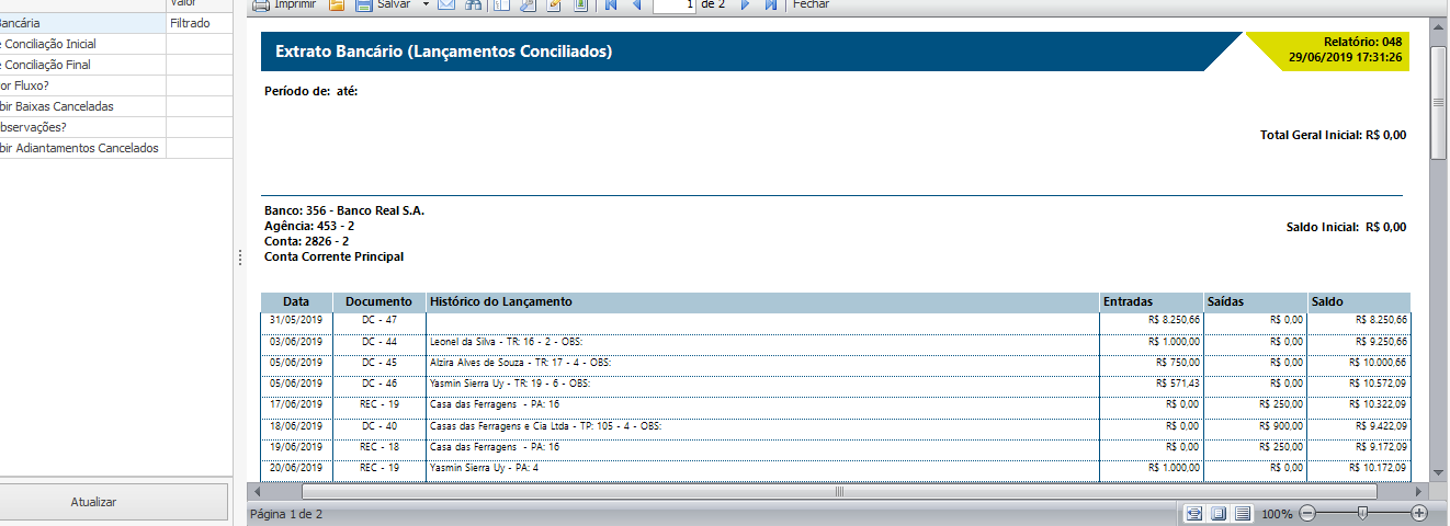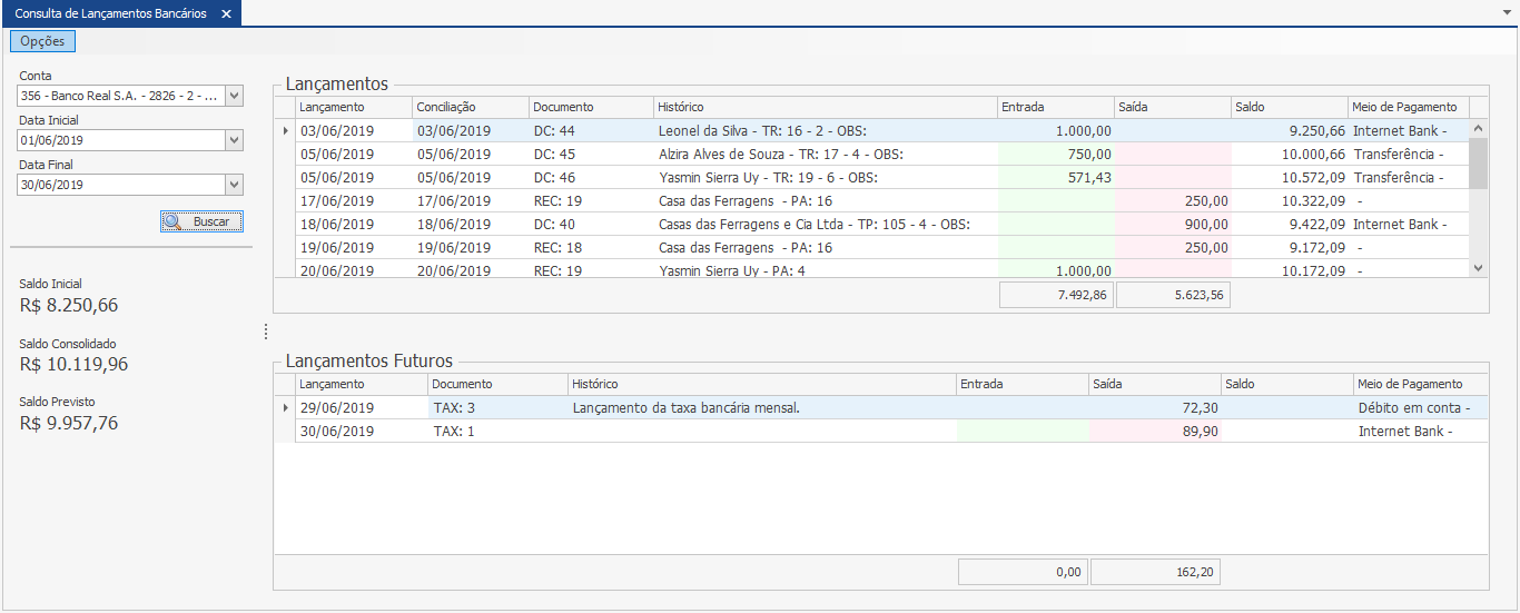 Abaixo dos filtros temos a composição dos saldos. Primeiramente o sistema mostra o “Saldo Inicial” que é o resultado do saldo final do dia anterior a 01/06/2019, ou seja, o saldo final de 31/05/2019.