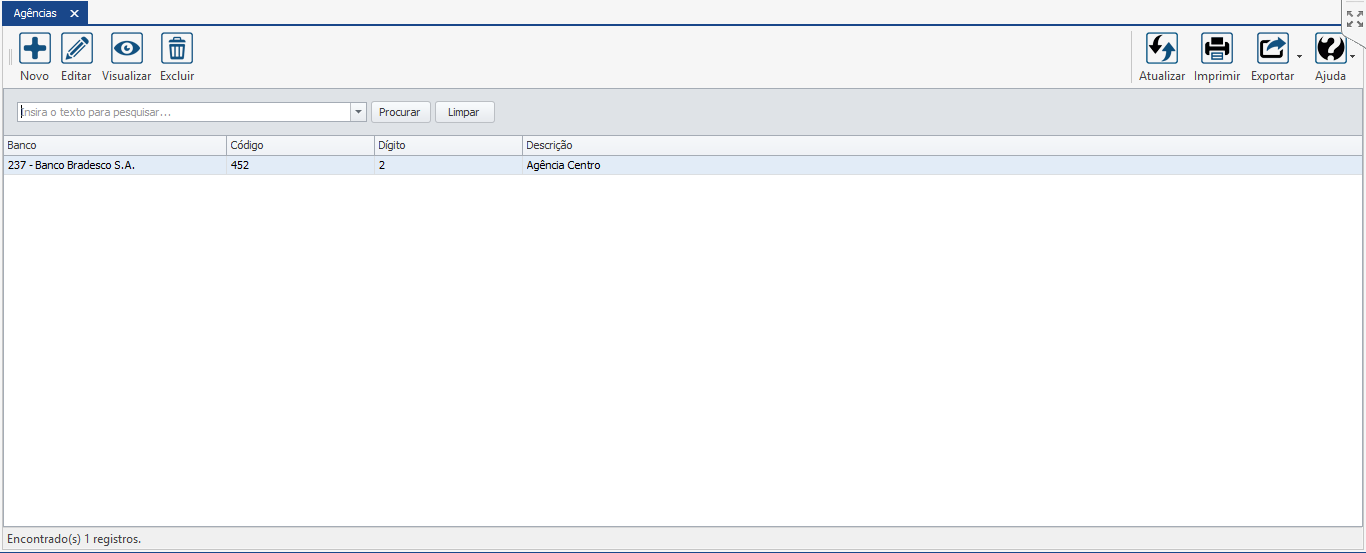 Ao acessar a tela principal do cadastro de Agências, será exibido um formulário dividido em duas partes. Na parte superior da tela encontra-se os botões de operações. Logo abaixo está localizado o filtro que quando utilizado, diminui o número de resultados encontrados em sua pesquisa facilitando sua busca. Conforme imagem abaixo: