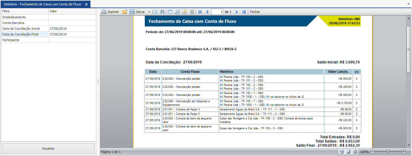 Veja abaixo um exemplo do relatório de “Fechamento de Caixa com Conta de Fluxo” com os filtros “Data de Conciliação Inicial” e “Data de Conciliação Final” selecionados.