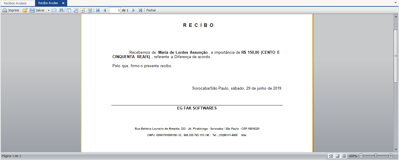 Na parte superior da emissão do recibo avulso encontra-se uma barra de tarefas que possuem opções para impressão do documento, salvar o documento em sua máquina em diversos formatos, alterar o tamanho da visualização etc.