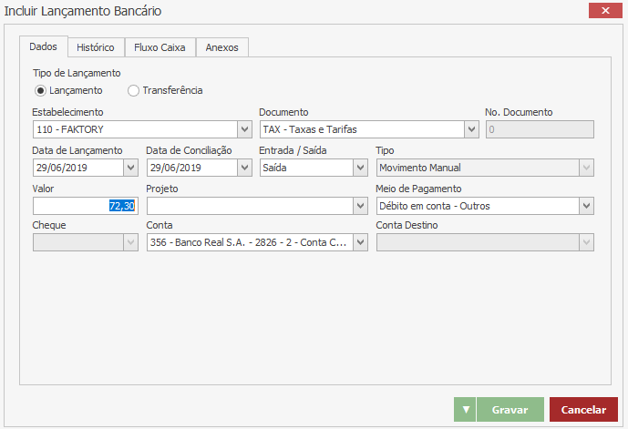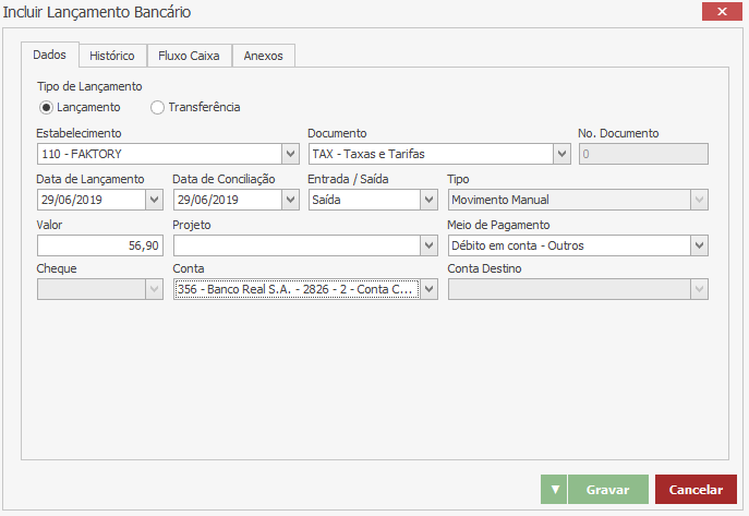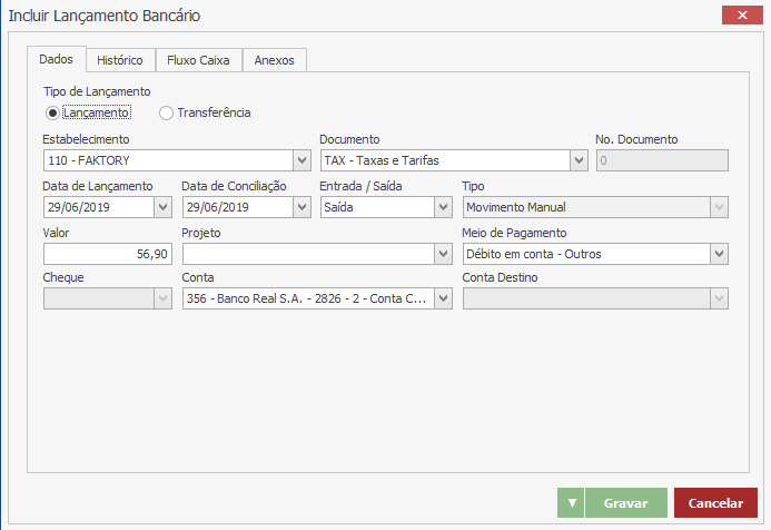 Note que foi aberta a tela de Inclusão de Lançamento Bancário com os mesmos dados lançados no lançamento anterior.