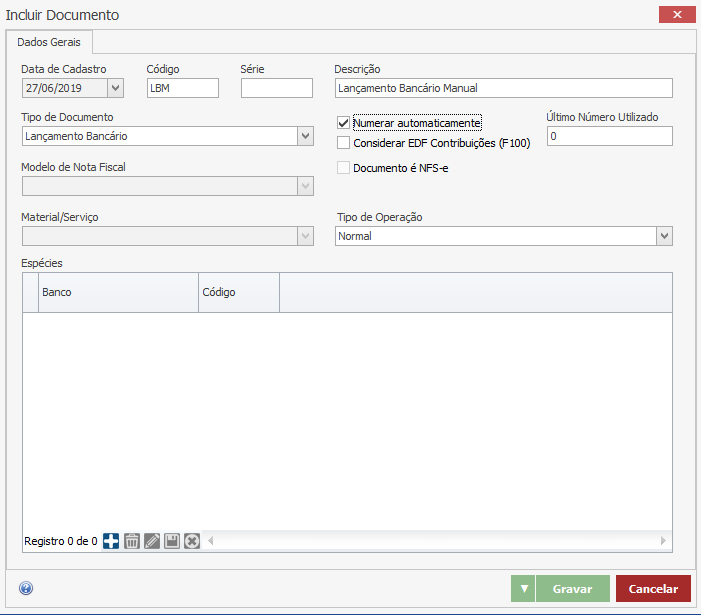 Último Número Utilizado - Informe o último número utilizado neste documento caso tenha marcado a opção “Numerar automaticamente”. O último número utilizado é o ponto de partida para o sistema iniciar a auto numeração sequencial. Neste nosso exemplo, mantemos o número zero, para o sistema começar a auto numeração do zero.
