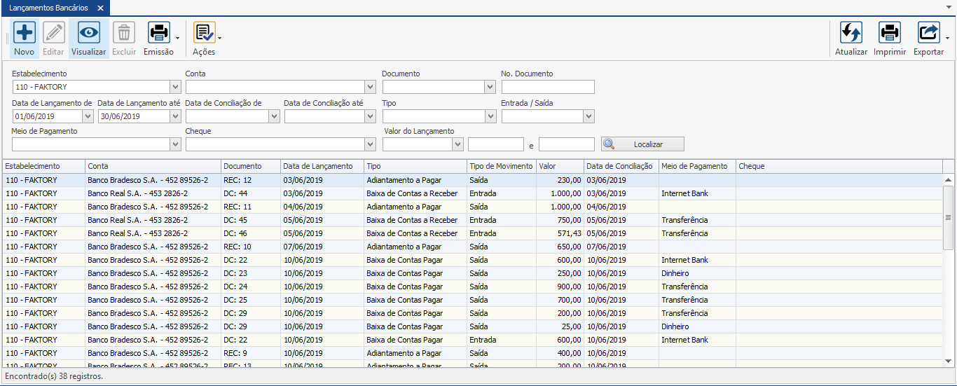 Através dos Relatórios de Bancos serão demonstrados todos os lançamentos bancários realizados no sistema Faktory One. O uso dos relatórios do sistema Faktory One permite inúmeras alternativas para análise, visto que os filtros disponíveis podem ser selecionados em conjunto com outros filtros, gerando centenas de visualizações completamente diferenciados.