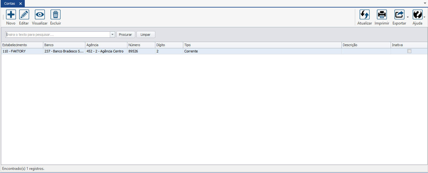 Ao acessar a tela principal do cadastro de Contas, será exibido um formulário dividido em duas partes. Na parte superior da tela encontra-se os botões de operações. Logo abaixo está localizado o filtro que quando utilizado, diminui o número de resultados encontrados em sua pesquisa facilitando sua busca. Conforme imagem abaixo: